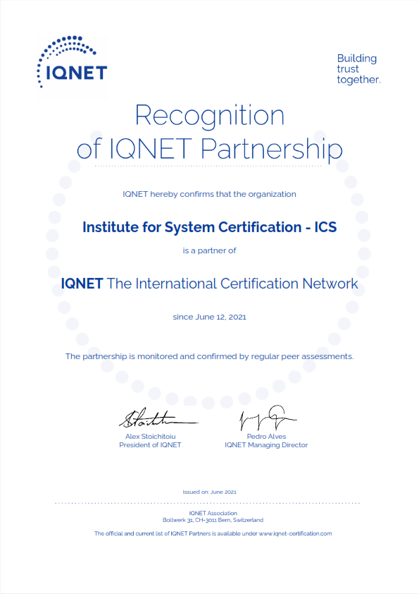Ovime je ICS potvrdio svoju potpunu kompetentnost i visoku profesionalnu reputaciju, kao i opredijeljenost da poštuje pravila rada i ponašanja renomiranih svjetskih certifikacijskih tijelaTime je za sve naše klijente otvorena mogućnost da istovremeno dobiju ICS i IQNet certifikate, koji imaju visoki ugled i kredibilitet širom svijeta.